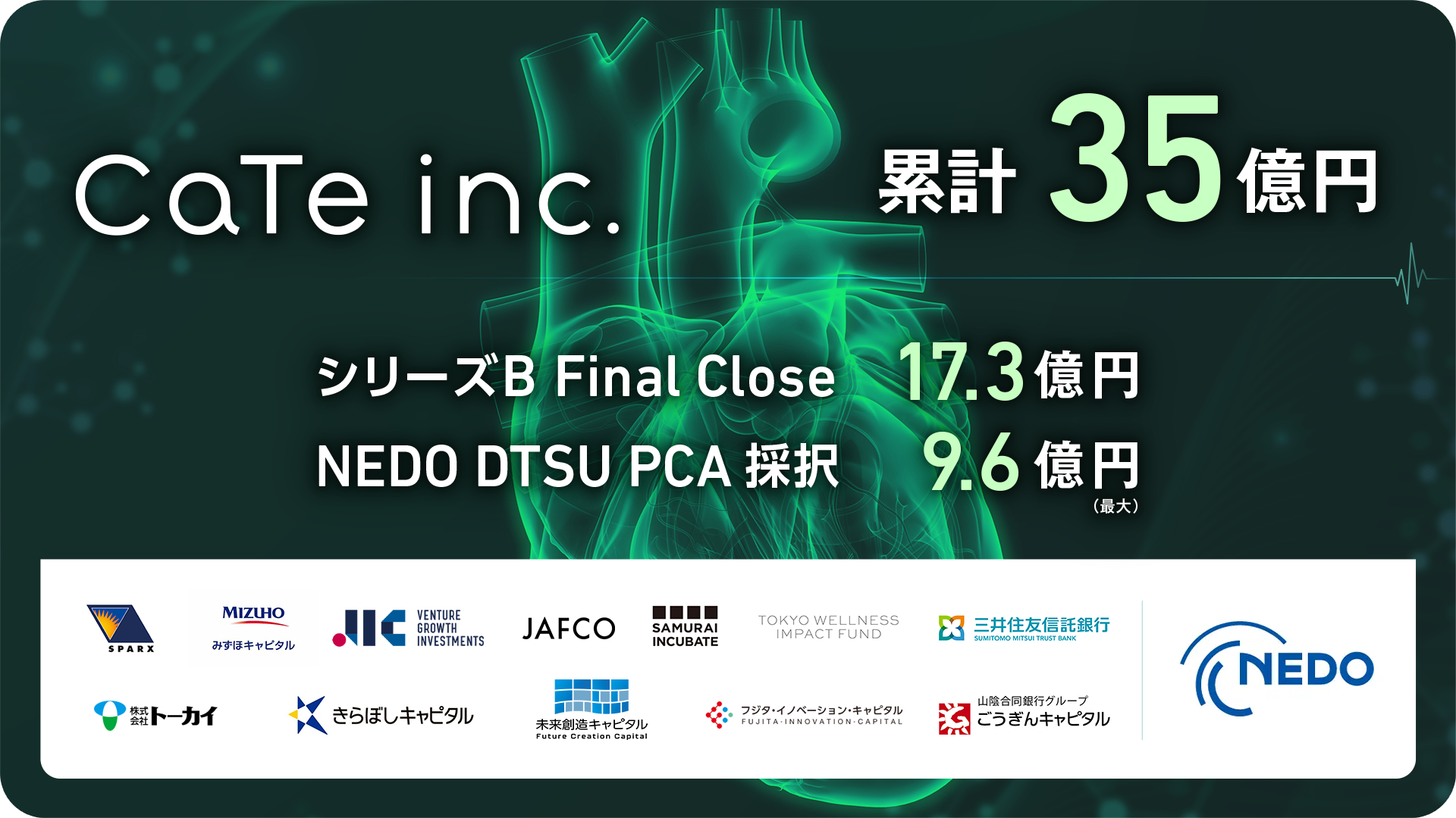 補助金9.6億円(最大)を含めた創業以来の累計資金調達額は35億円となり、心臓リハビリプログラム医療機器の社会実装を推進