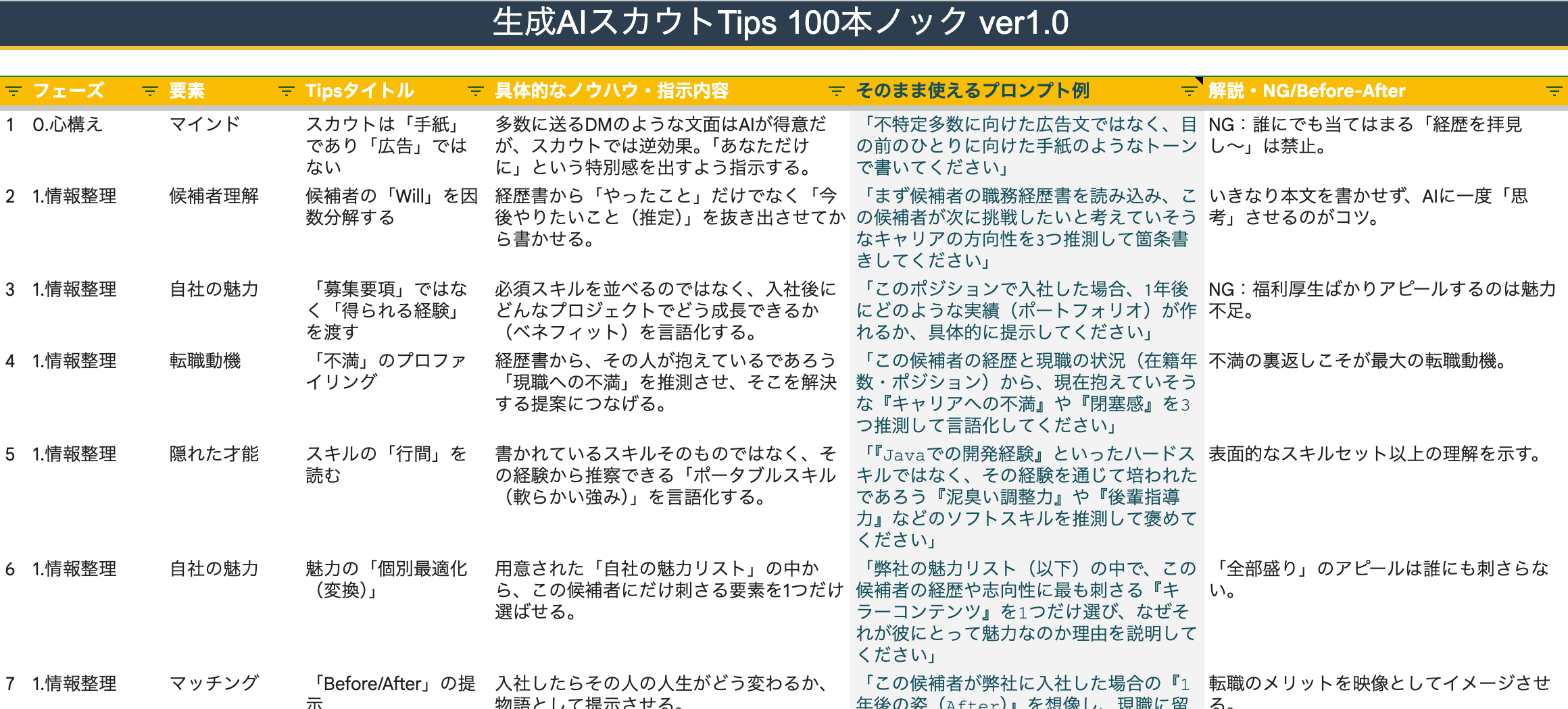 本資料は、AIスカウトの返信率を高めるための「理論・戦略マニュアル(PDF)」と、コピー&ペーストですぐに使える「実践プロンプト集(Excel)」がセットになっています。