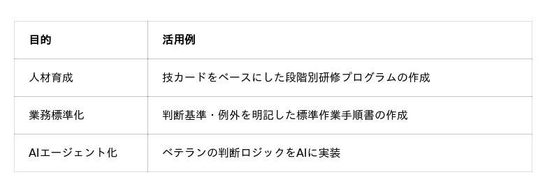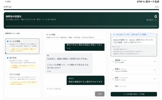 - AIが深掘りして技カード化:「5つの問い」で暗黙知を言語化