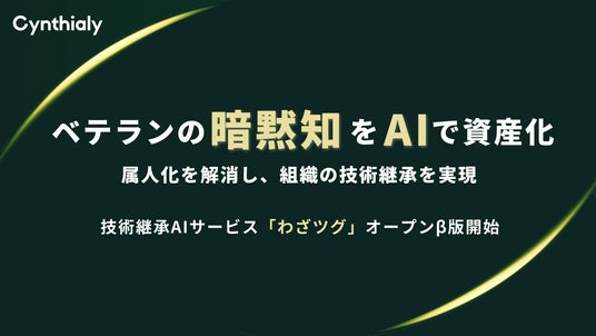 法人向けの生成AI人材育成・事業成果の創出支援行うシンシアリー株式会社(本社:東京都渋谷区、代表取締役:國本知里、以下シンシアリー)は、製造業をはじめとする現場のベテラン人材が持つ暗黙知を形式知化し、組織の資産として継承するサービス「わざツグ」のオープンβ版提供を開始いたしました。