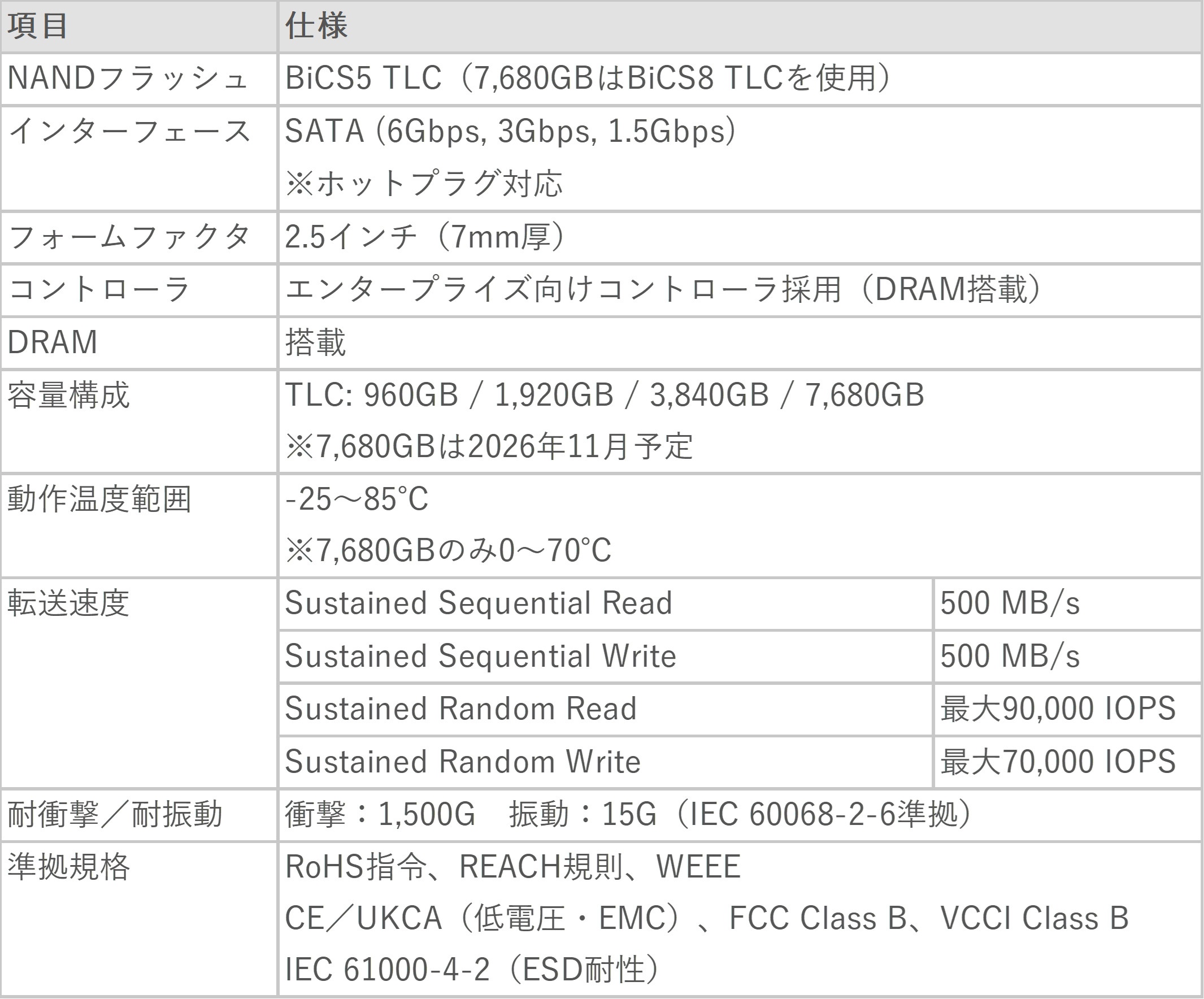 960GBから3,840GBモデルで-25~85℃の動作温度範囲に対応し、7,680GBモデルについても0~70℃を確保することで、屋外設置機器や制御盤内、装置組込みなど温度変動の大きい環境での利用を想定した設計としています。