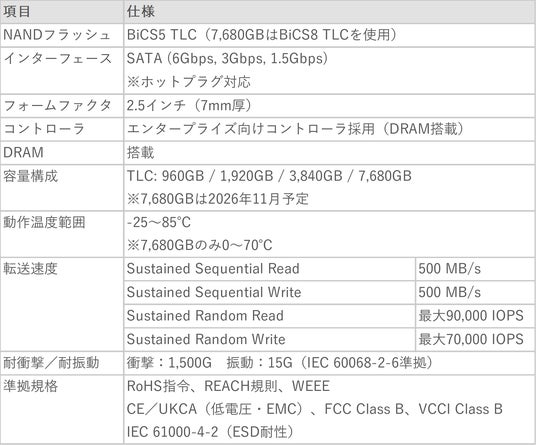 BiCS5/BiCS8 TLC NANDを採用し、960GBから7,680GBまでの容量構成を用意することで、産業機器ログから監視カメラ映像、エッジAI推論用ワークスペースまで、用途に応じた容量選択が可能です。