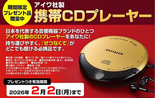 2月2日(月)までのキャンペーン期間中に本商品をWEBサイトからお申込みいただきますと、期間限定プレゼント「アイワ社製 携帯CDプレーヤー」を贈呈いたします。CD全集『せつなくて』を、お得な条件でご入手いただける好機となっております。