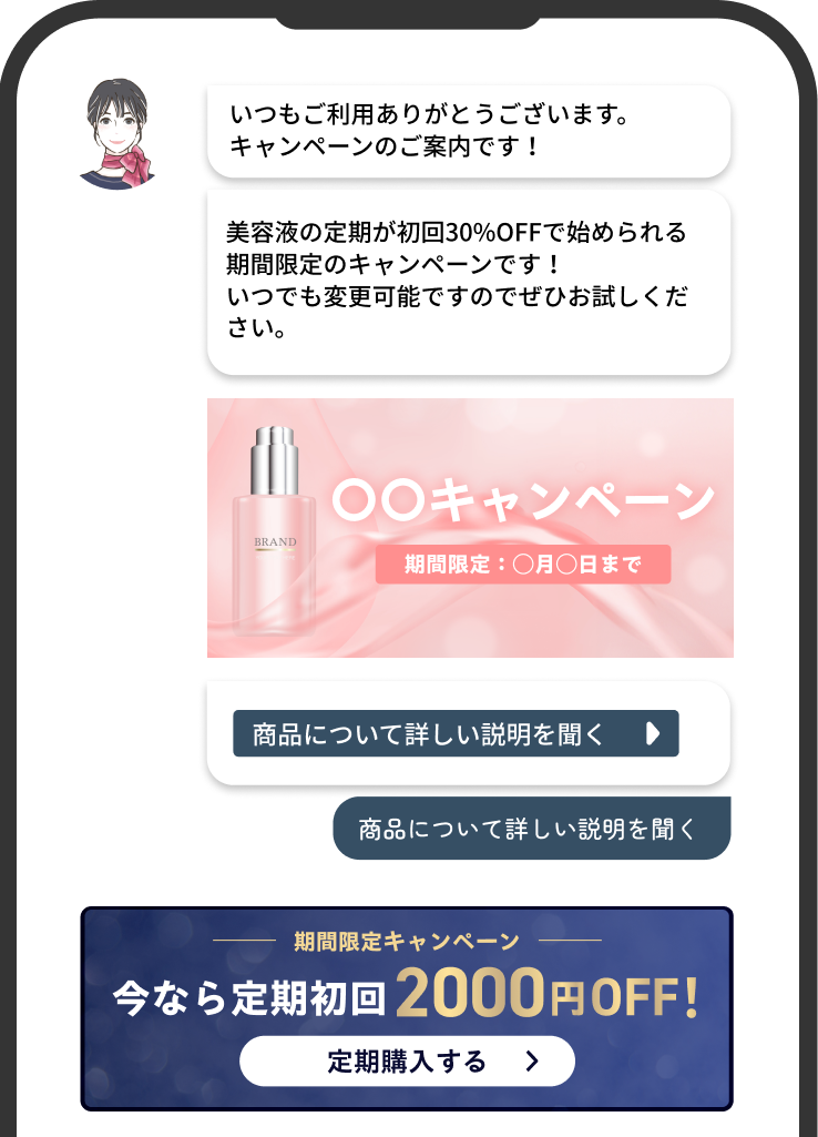 チャットページは会話速度を最適化し、ユーザーの心情に寄り添うことでWeb上でありながら、温かみのある心地よいコミュニケーションを体現します。この体験がユーザーの自発的な意思決定を促し、CV向上のみならず、LTV(顧客生涯価値)改善まで見据えた企業の成長を支援します。