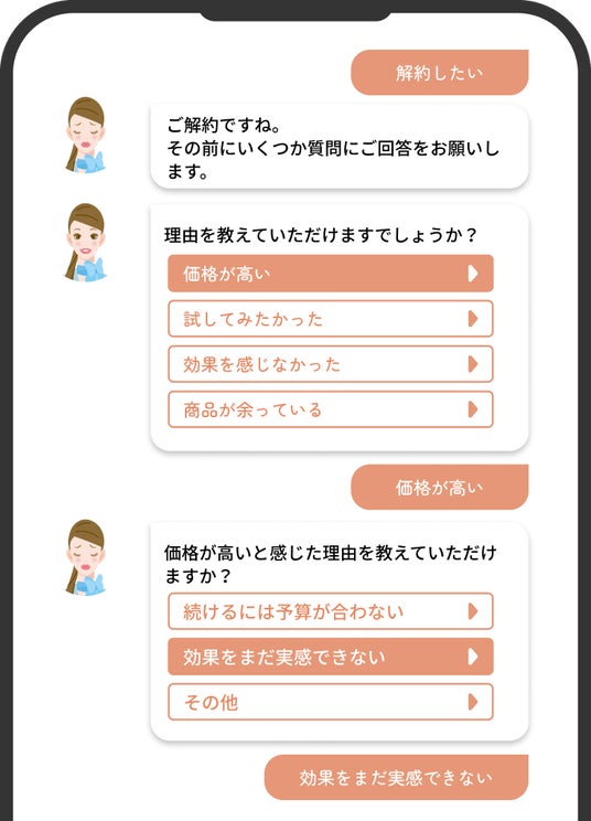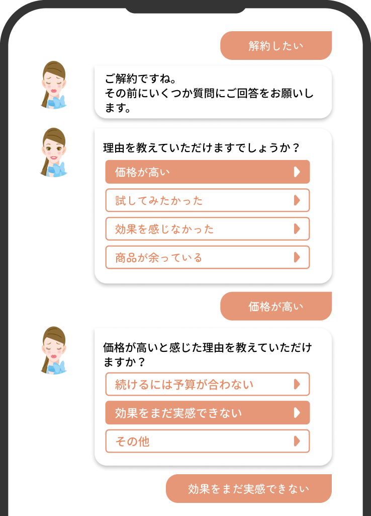 Web上でありながら、アイコンの表情変化やエモーショナルな会話を実現します。この温かみのあるコミュニケーションが顧客の心情に寄り添い、解約の裏に隠された「真の本音」を顕在化させます。