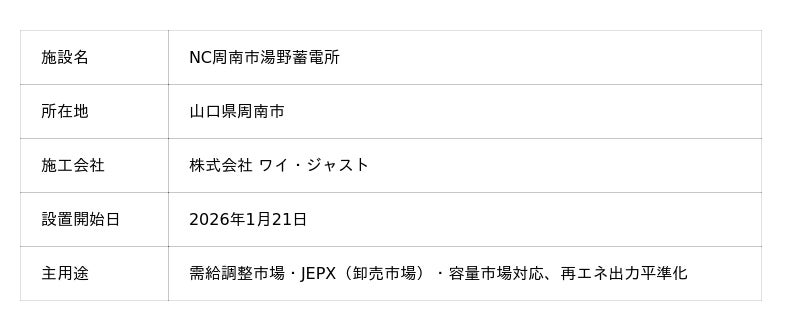 【日本蓄電池株式会社】山口県周南市にて系統用蓄電施設「NC周南市湯野蓄電所」蓄電池設置開始