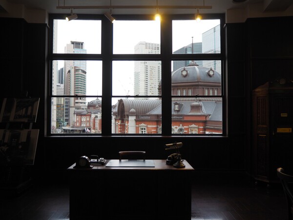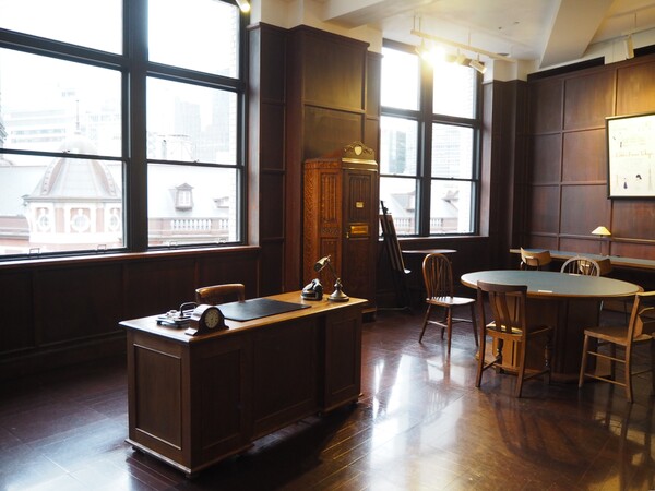 入ってみると、そこにはあめ色の木の床、漆喰の天井、重厚な机などが配され、まるで時が止まったかのよう。窓からは丸の内駅舎のドーム屋根がすぐ目の前に見え、外の喧騒とはうって変わって静かな時間が流れています。東京駅のすぐ目の前にこんな素敵な空間があったのですねー。