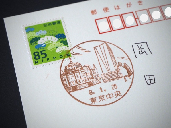 この風景印が押された郵便を受け取ってみたいな、と思い、JR東京駅丸の内南口改札の目の前に立つ商業施設「丸の内KITTE」に向かうことに。もともと旧東京中央郵便局舎があったところで、1階に「東京中央郵便局」があるので、ここでハガキと切手を買って手紙を投函しようと考えたわけです。