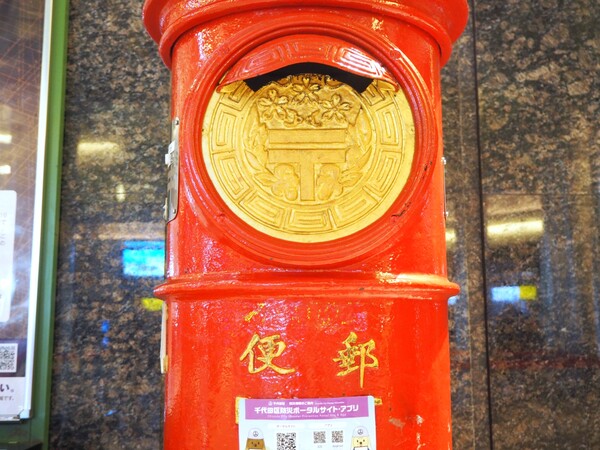 向かう途中、丸の内南口改札の外にもう1つ見慣れないポストを発見しました! 投函口にひさしが付いた真っ赤な丸形のポストです。乗降客の人混みに紛れていましたが、スッと立つ姿はなかなかの存在感。このレトロな丸い形、今ではほとんど見なくなりました。懐かしいですねー。